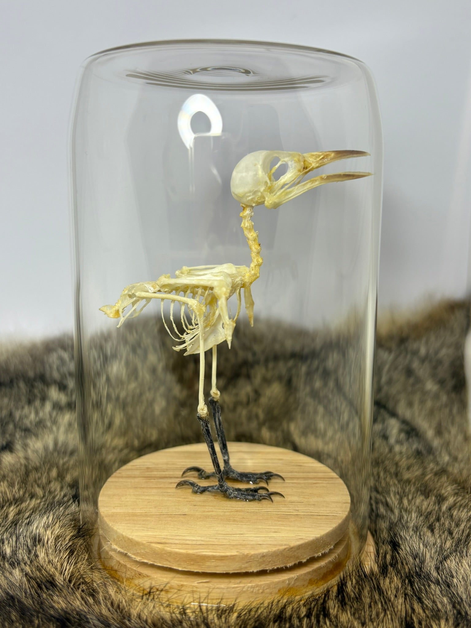 Displayed in a small dome and shows the intricate details of the skleton of the Common Iora, care fully mounted within a setup provides an unobstructed, close-up perspective of the bird’s anatomical structure, offering important insights into its skeletal morphology.