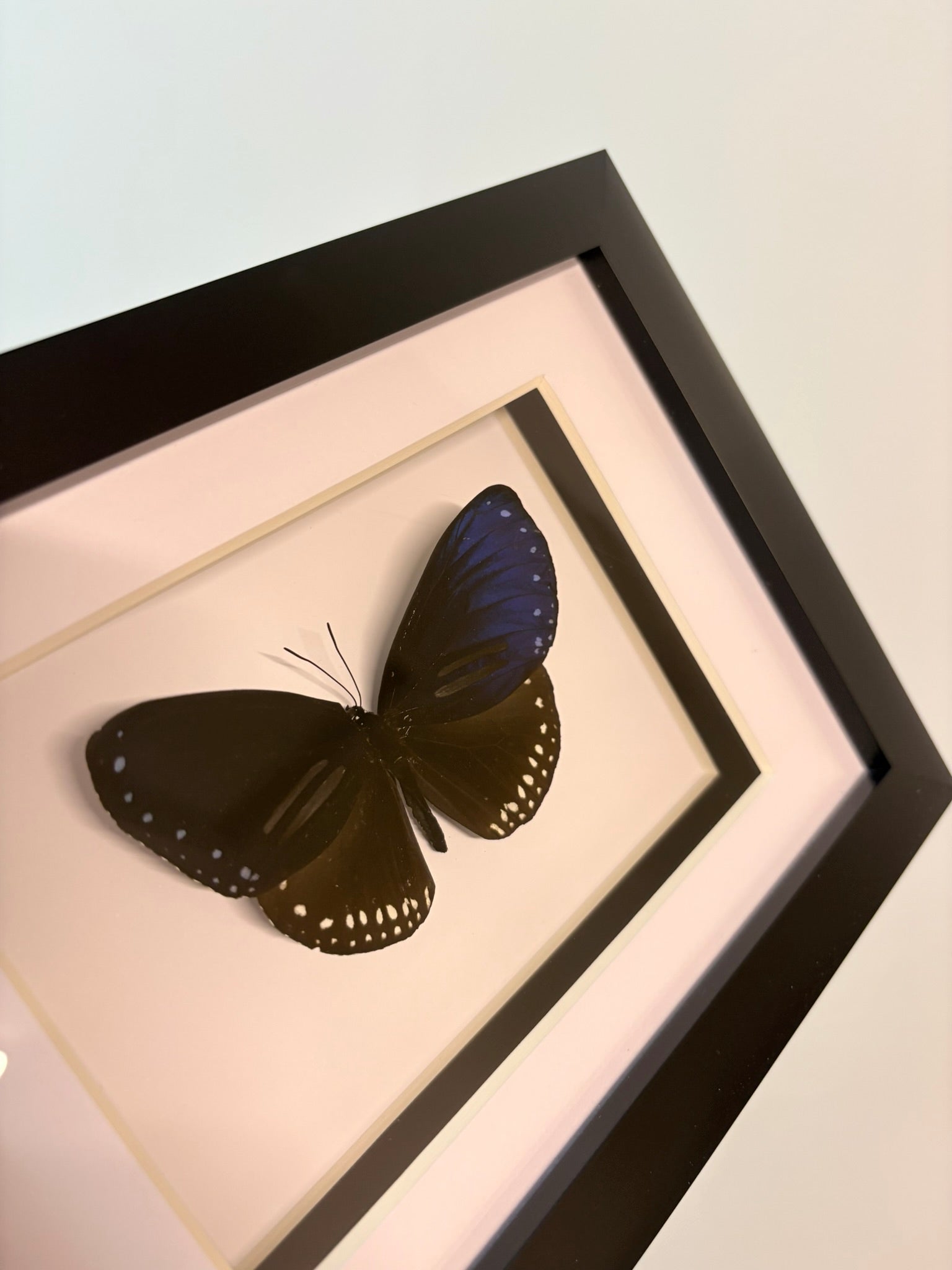 The Euploea mulciber, commonly known as the Striped Blue Crow butterfly, features deep chocolate-brown wings accented with striking blue and white markings. This elegant specimen is beautifully displayed in a 5" x 7" frame, making it a perfect addition to any collection.