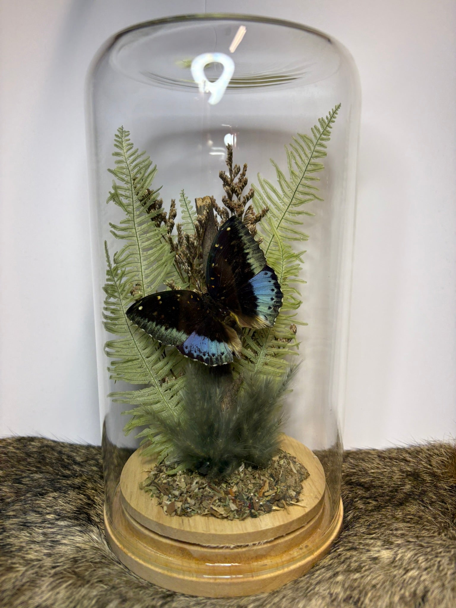 This large dome features a stunning Archduke butterfly (Lexias sp.), artfully arranged with natural elements to create a vibrant and lifelike scene. A perfect blend of entomology and decor, this display brings a touch of nature’s beauty into any space.