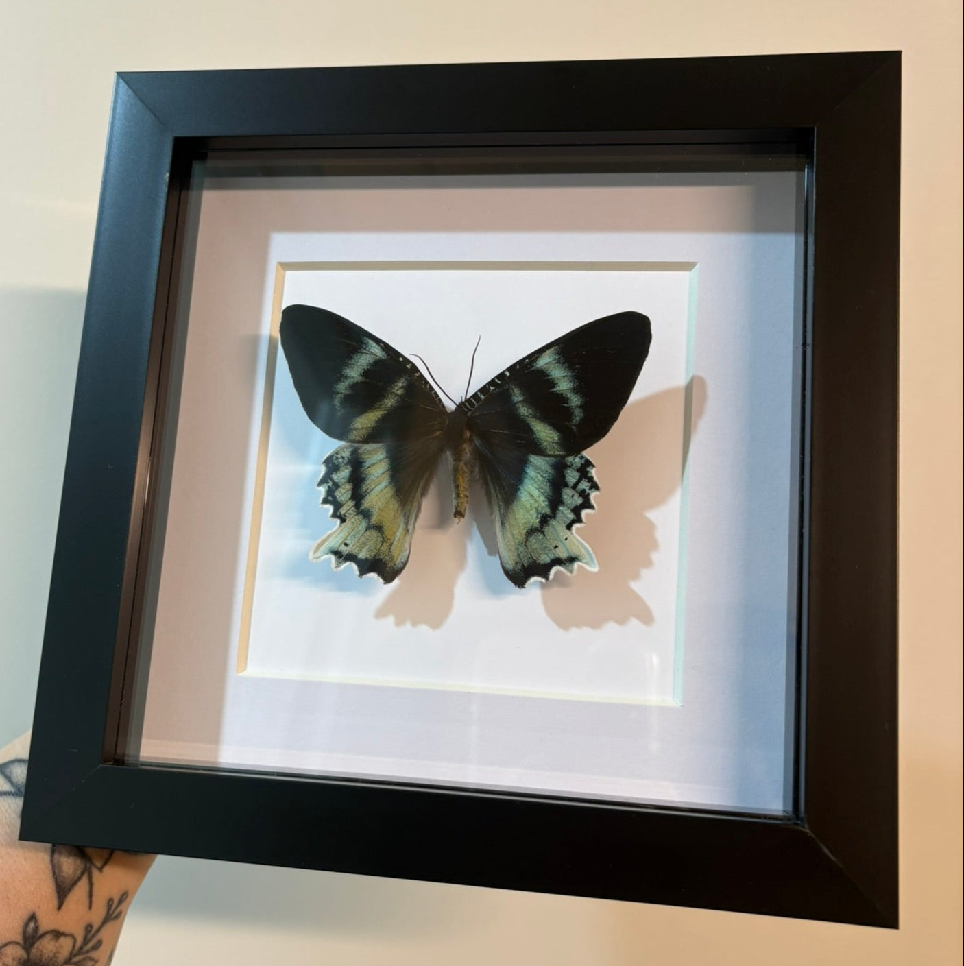 The Alcides orontes, also known as the Blue Day-Flying Moth or Swallowtail Moth, is admired for its iridescent blue-green wings and swallowtail-like shape. This striking specimen is beautifully displayed in a 6" x 6" frame, making it a standout piece for any collection.