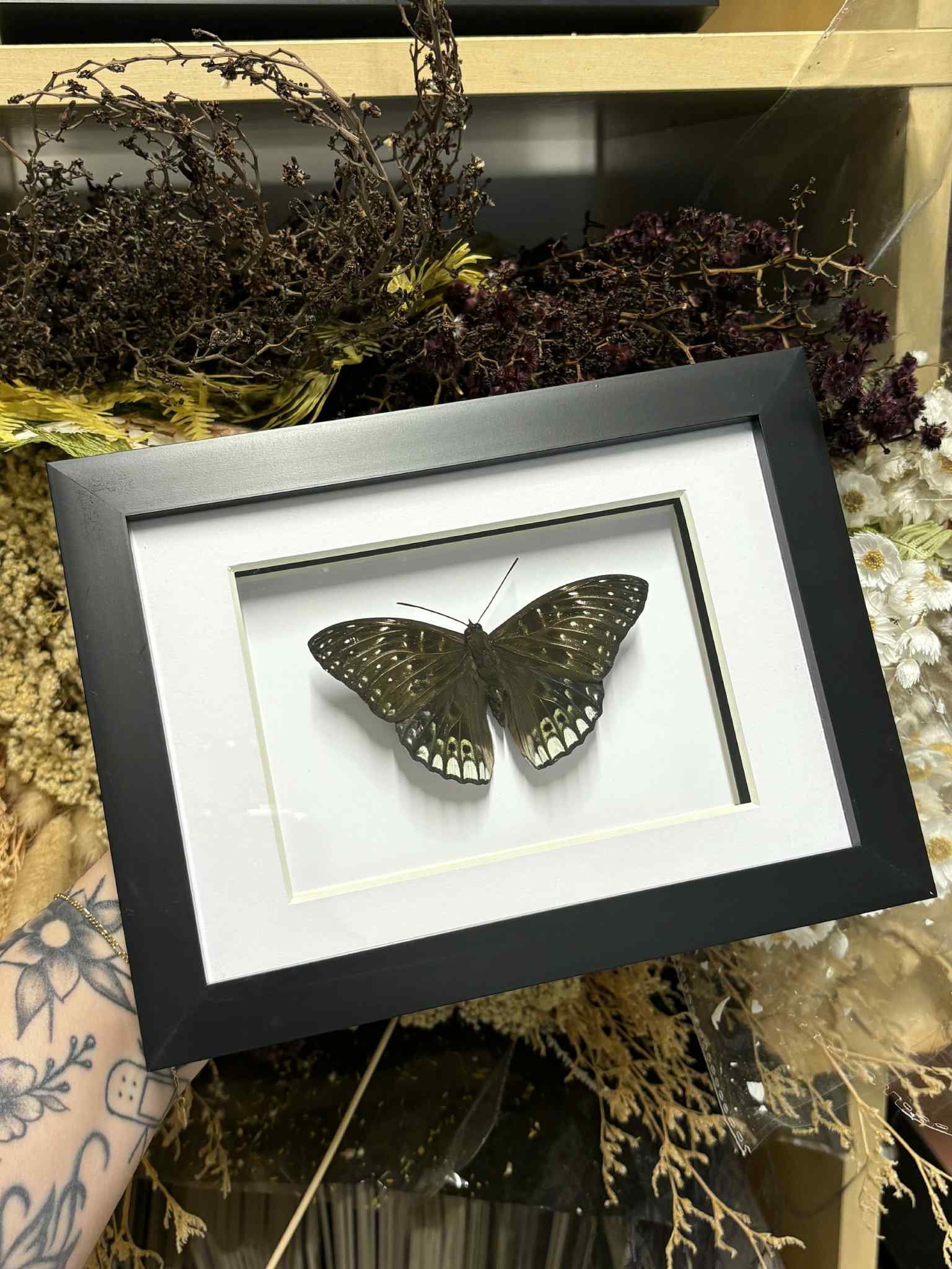 The Dichorragia Ninus Ninus, commonly known as the White Edged Constable butterfly, is beautifully displayed in a 5" x 7" frame. Its distinctive white-edged wings make it a striking addition to any collection or decor.