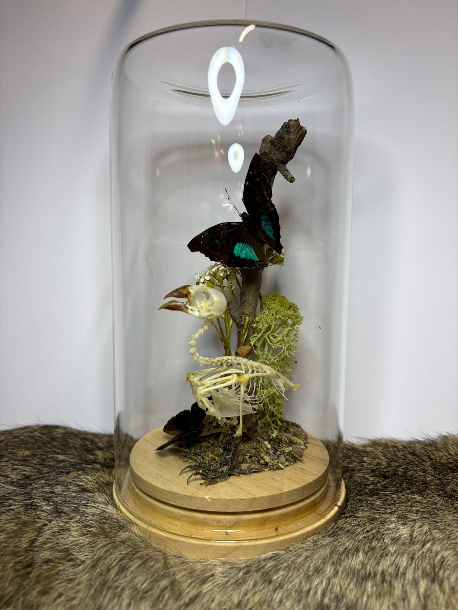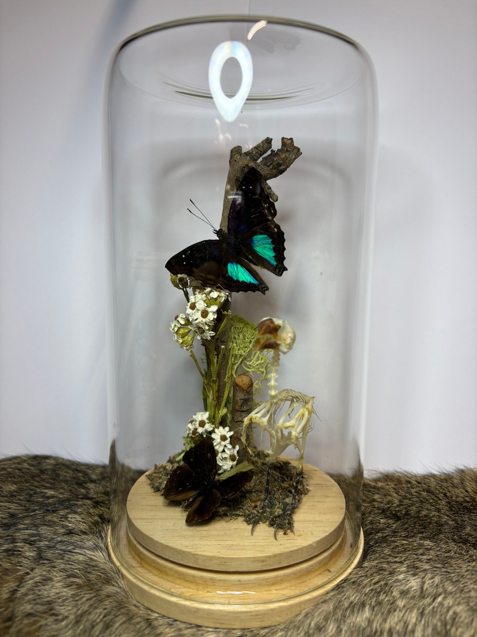 This captivating large dome features the delicate skeleton of a Lonchura punctulata (Scaly-breasted Munia) paired with a striking Doxocopa cherubina butterfly and additional butterfly specimens. The arrangement combines natural history and art, creating a truly unique statement piece for any collection or display.