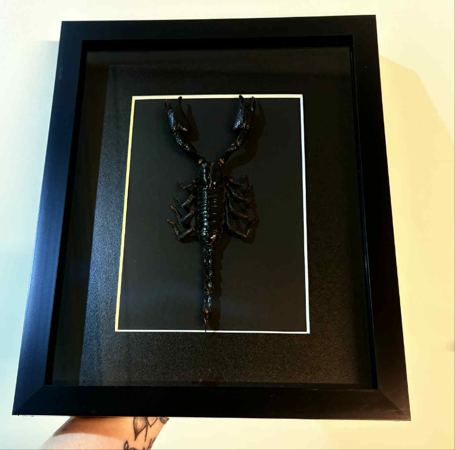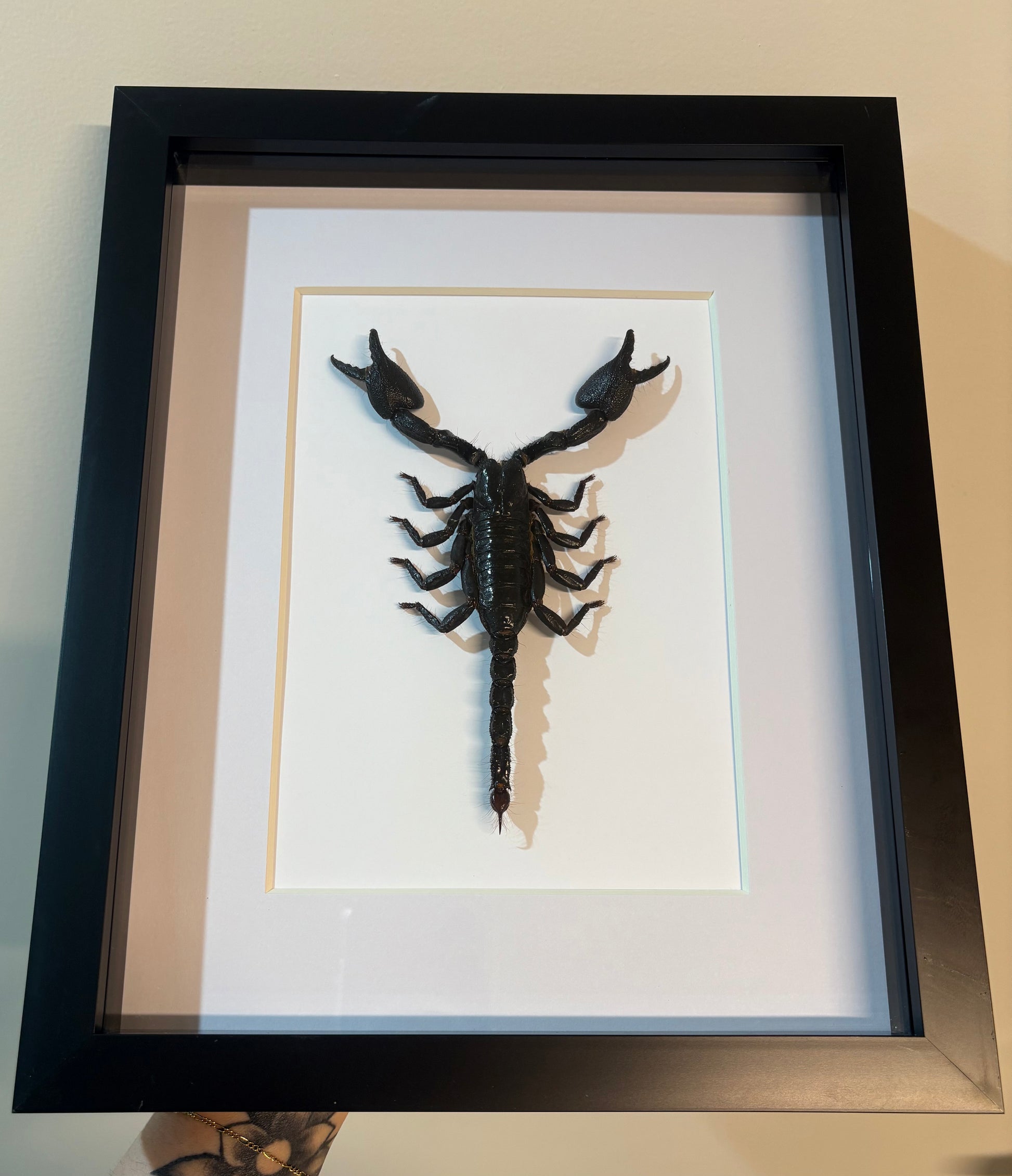 The Javanimetrus cyaneus, known as the Asian Blue Forest Scorpion, is native to Borneo, the Philippines, and Indonesia. Famous for its striking blue-black coloring, this impressive specimen is beautifully displayed in an 8" x 10" frame.