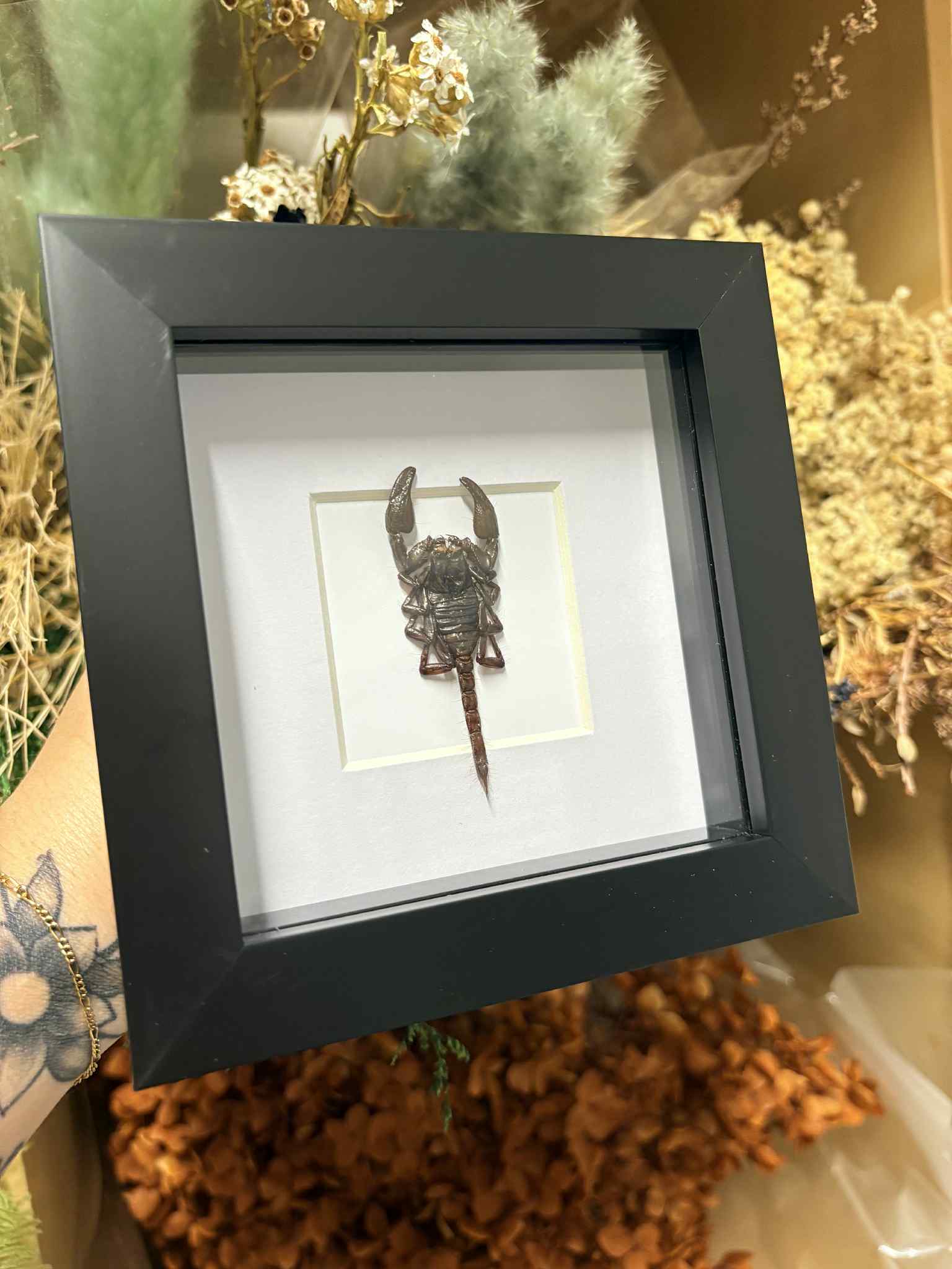 Javanimetrus Cyaneus is known as the Asian Blue Forest Scorpion, is native to Borneo, the Philippines and Indonesia. Known for its striking Blue-Black colouring. This Small specimen will be displayed in a 4inch x 4inch frame.