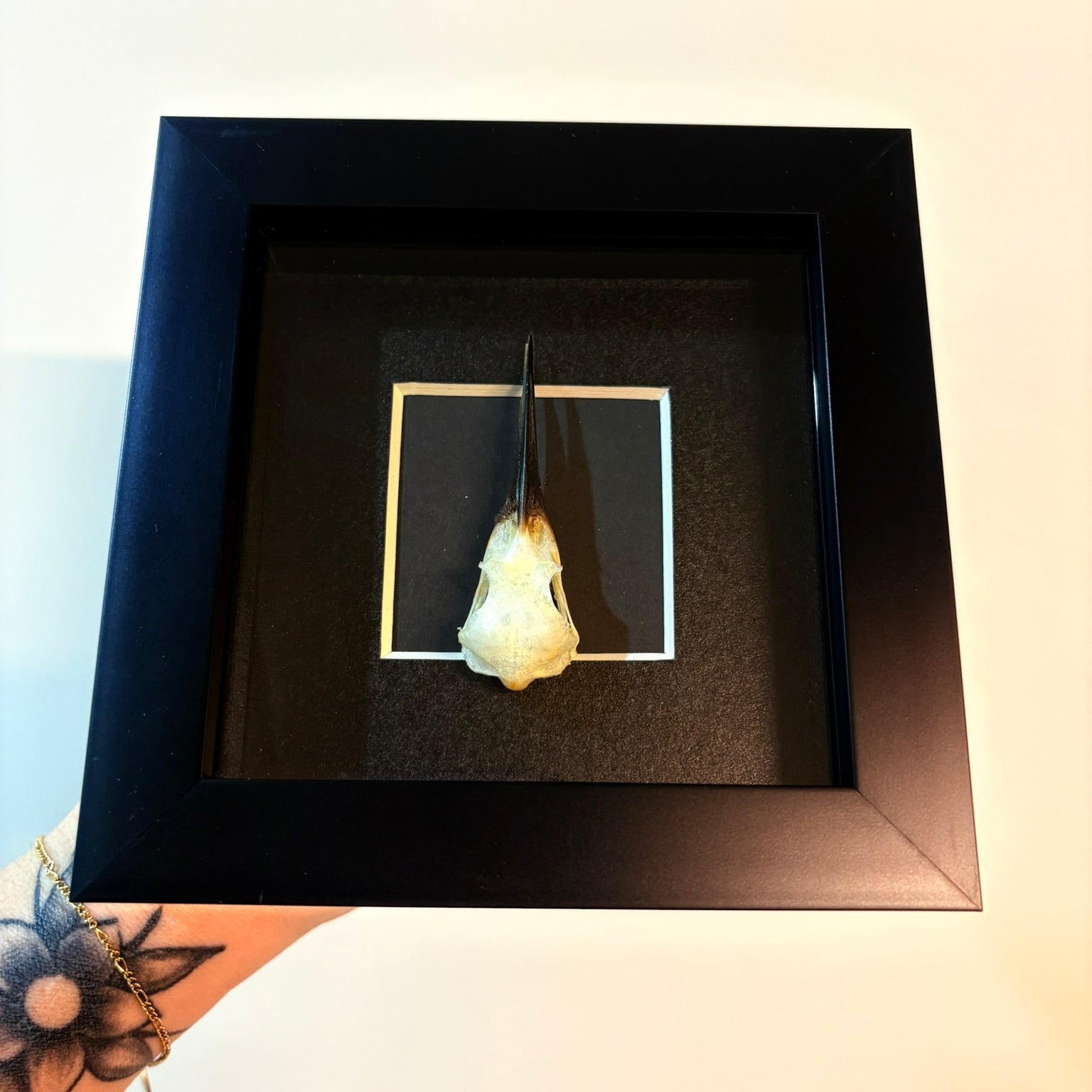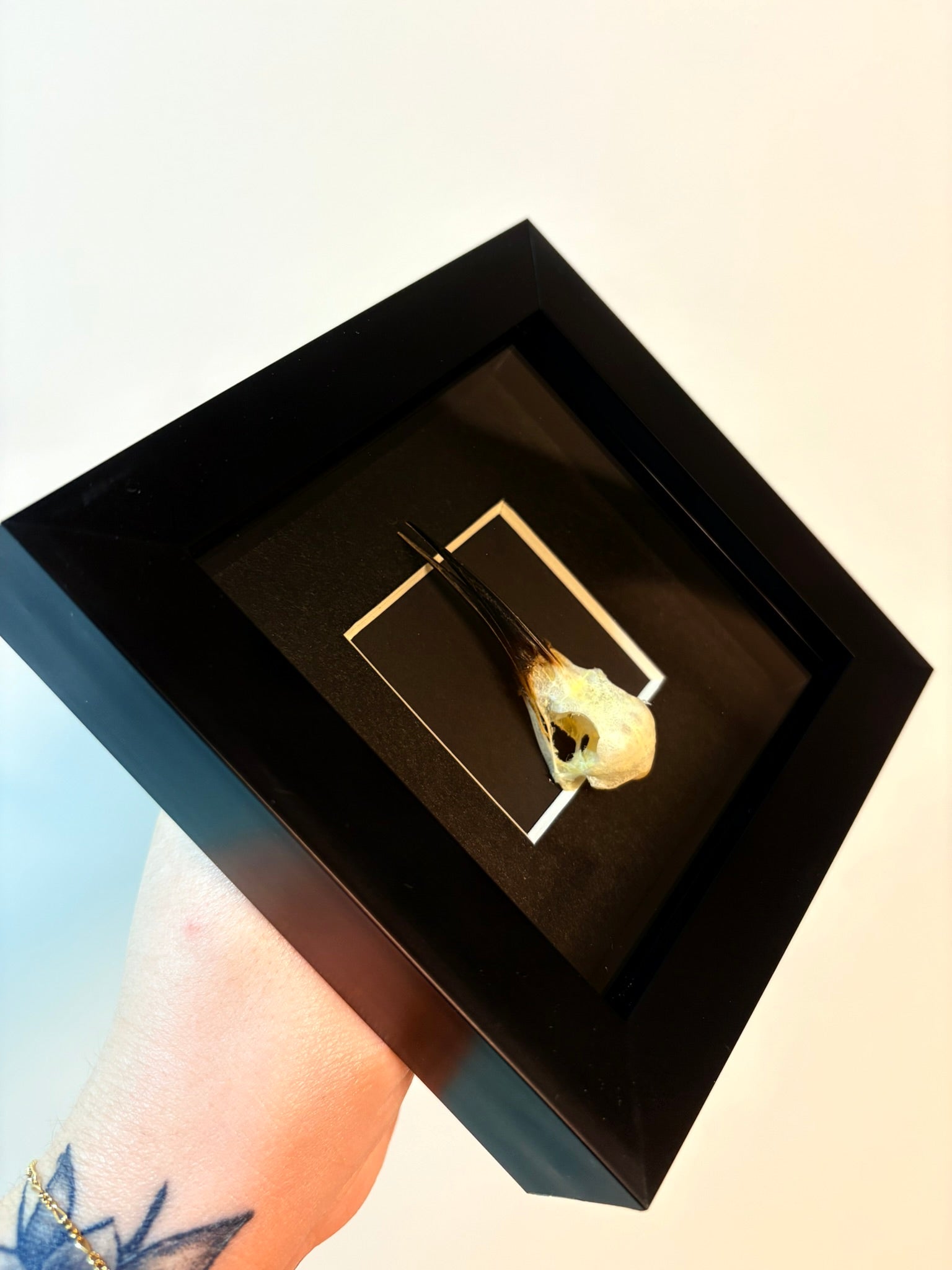 The Merops philippinus javanicus, commonly known as the Blue-Tailed Bee-Eater, is beautifully showcased with its skull mounted in a 4x4 inch frame. This compact display highlights the delicate bone structure of this vibrant bird, making it a unique piece for collectors or nature enthusiasts. Perfect for adding a touch of natural history to any space, this framed skull offers a fascinating glimpse into avian anatomy in a subtle and elegant presentation.