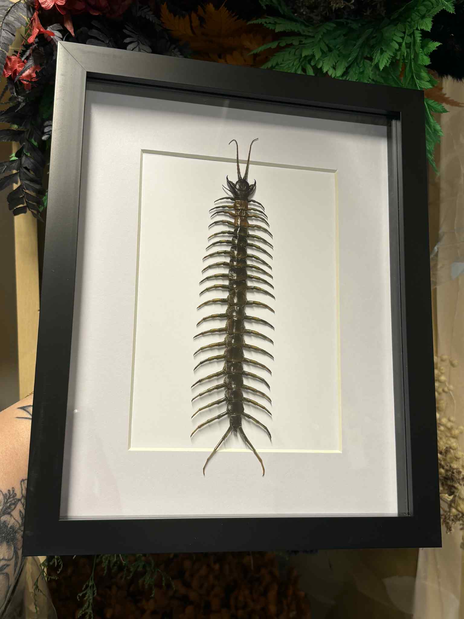 The Scolopendra piceoflava, commonly known as the Giant Centipede, is native to Southeast Asia. This striking specimen is showcased in an 8" x 10" frame, making it a captivating addition to any collection.