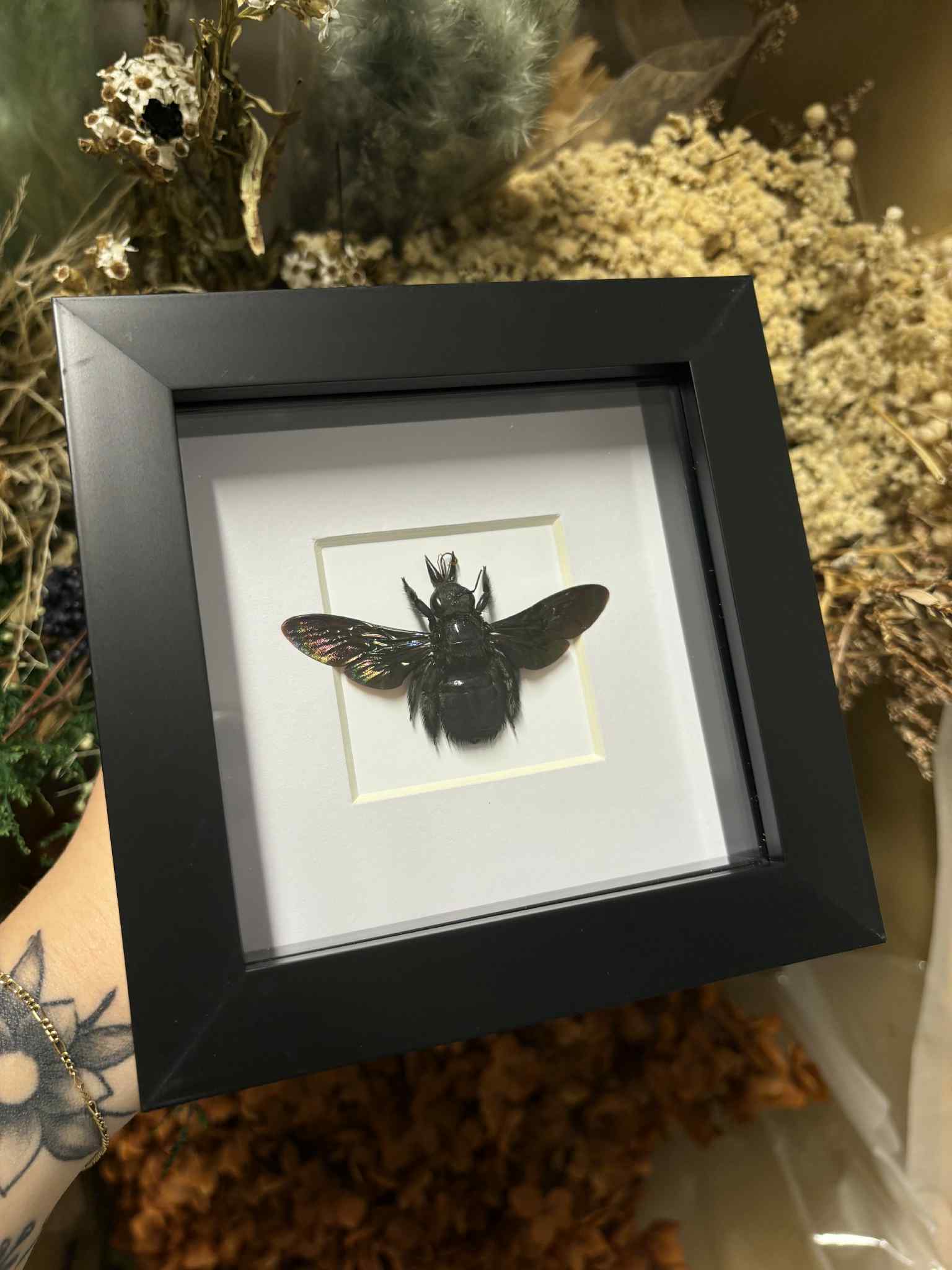 The Xylocopa Latipes, or Female Black Carpenter Bee, is found throughout Southeast Asia. Known for nesting by burrowing into wood within forest habitats, this impressive bee is displayed in a 4" x 4" frame against a white background, highlighting its robust form and glossy black coloration.